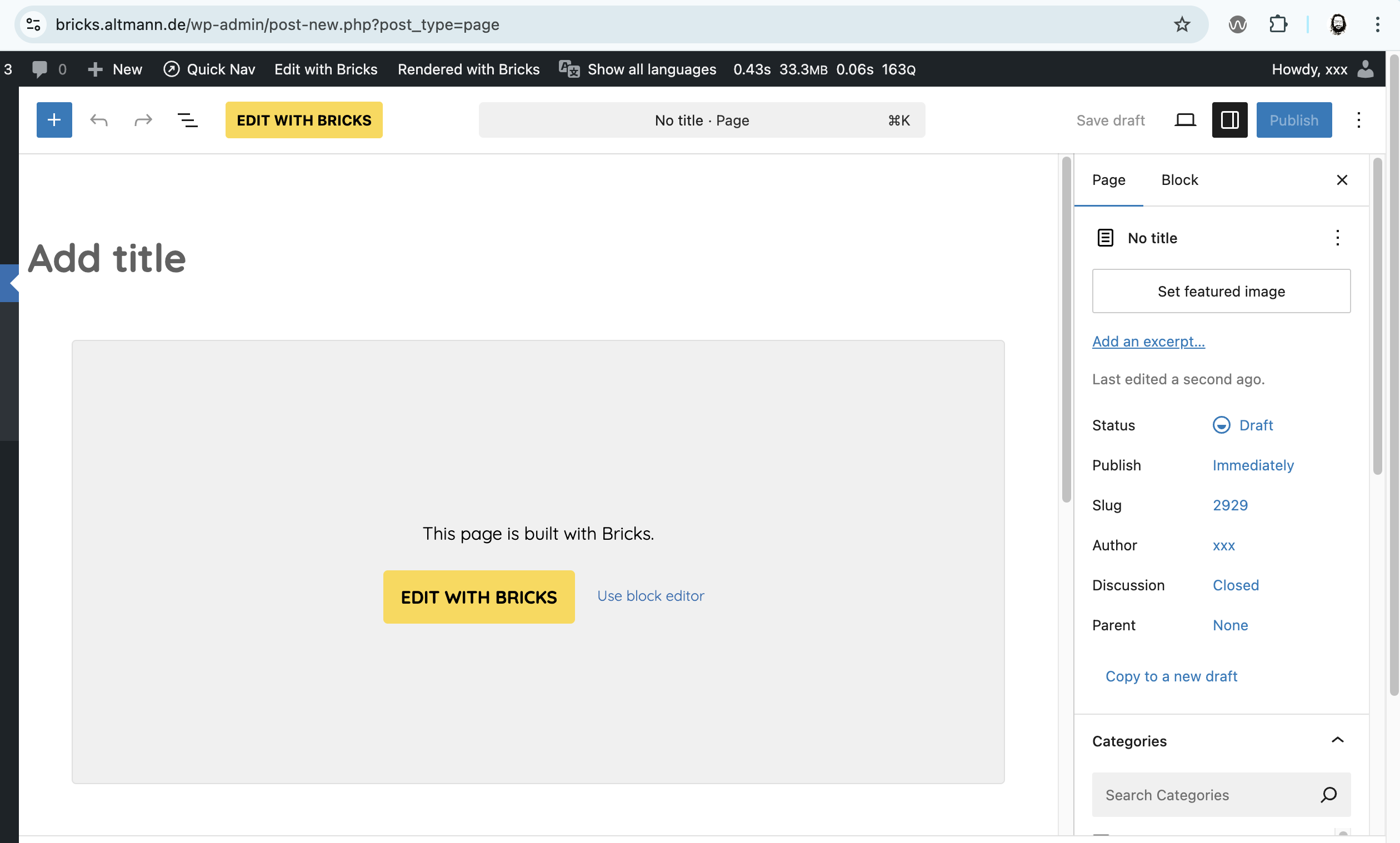 For me, the “built with Bricks” block is already shown when I just click “New Page”, even before I did enter a title or save the page.