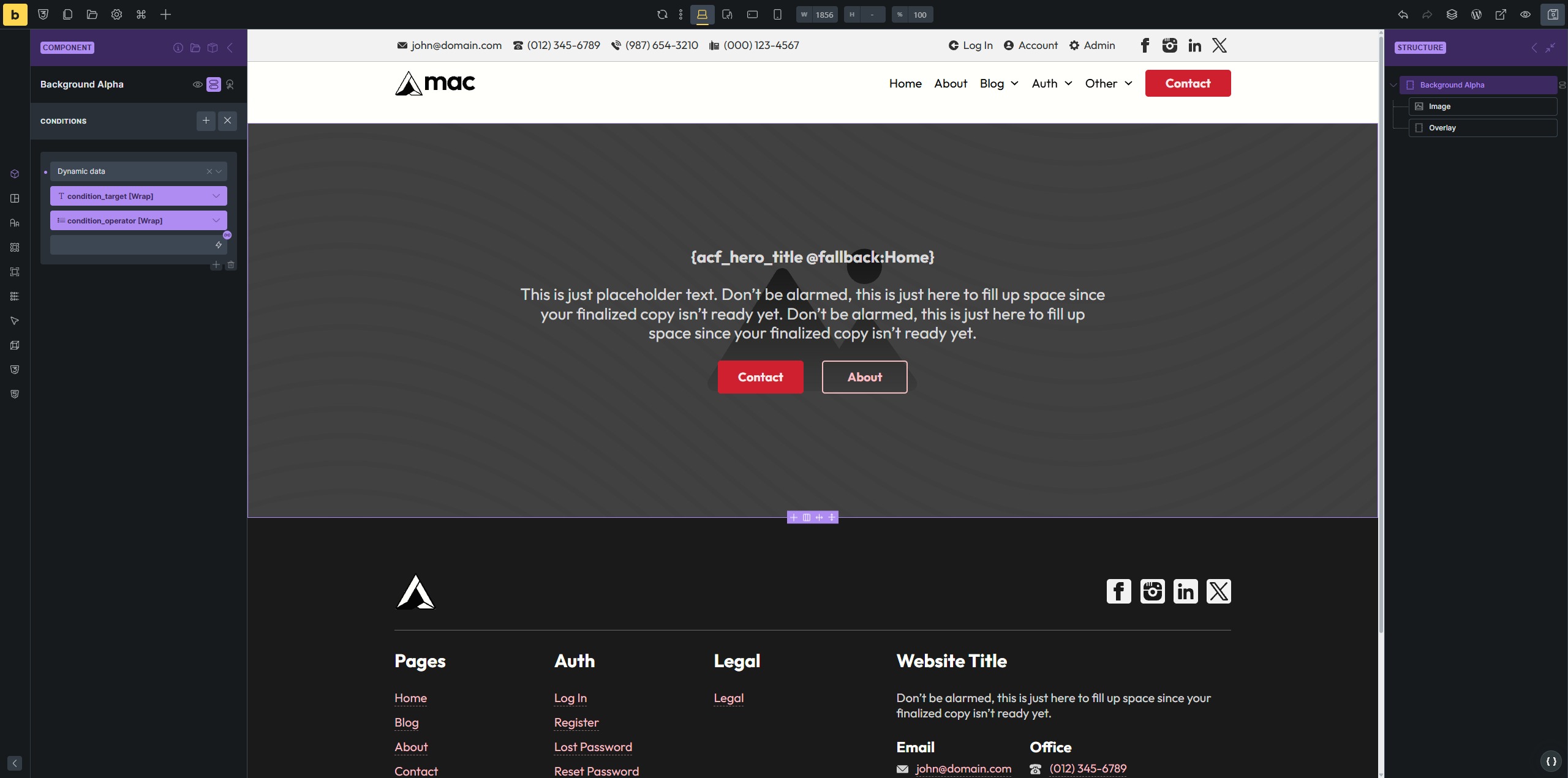 My Footer Alpha footer component should also have a background image, but same story - the behavior is very strange. Conditions seem to be working, but incorrectly. For example, if I set the condition featured_image is not empty (via props) on the Background Alpha component that’s in my footer, the Background Alpha background will display on the front-end, but it SHOULD NOT, as my featured_image is actually empty.
