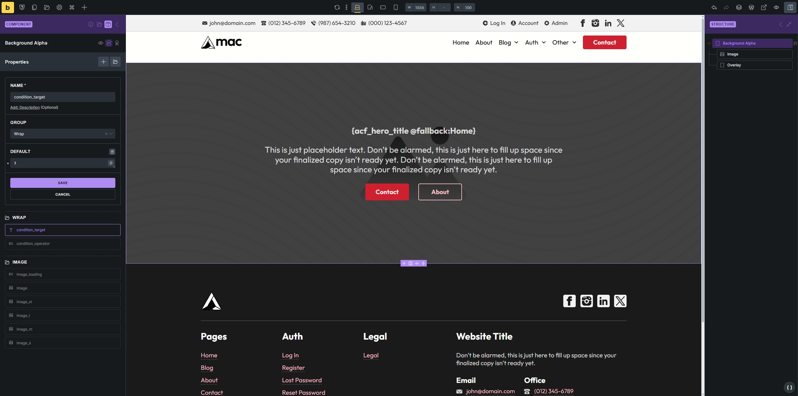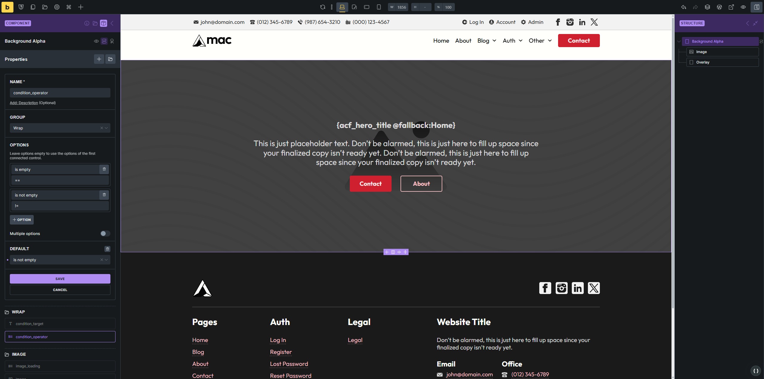 In the example below, I have a Background Alpha component, with props “condition_target” and “condition_operator”. The “condition_target” property has a default of “1”, and the “condition_operator” has a default of “is not empty” (actual value is !=).