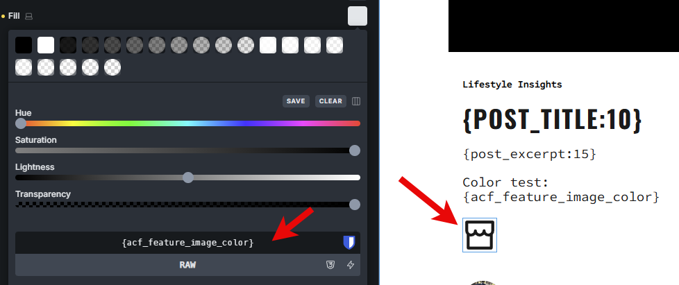 PS, the reason I have a variable here is because my workaround is to set the ACF color into a custom style attribute that sets the variable, which I can then use for the fill as custom RAW color. But I’d still like to know why the ACF field doesn’t work directly.