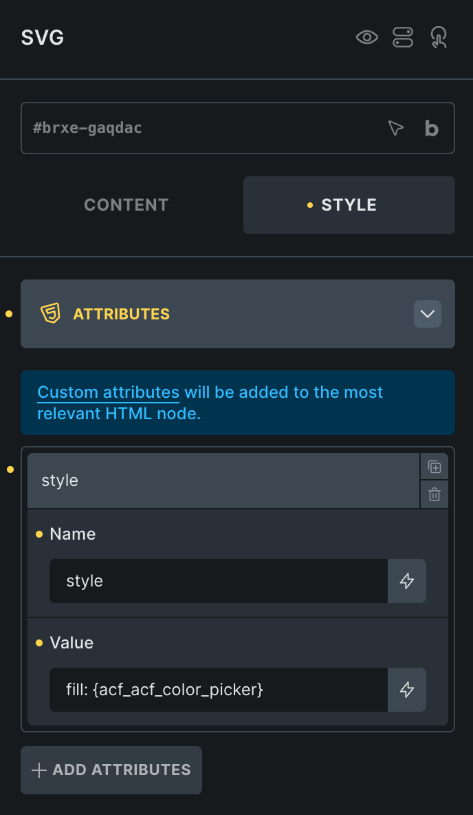 In Bricks I attach the color to the RAW field of a svg element fill color.