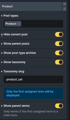 I’ve tried every variation on the breadcrumb settings i can think of (including using product_cat as the taxonomy slug, enabling “show post type archive” and selecting products as a post type. these all have effects on the single product template, but changing them doesn’t seem to do anything on the product archives (i.e. the category pages)