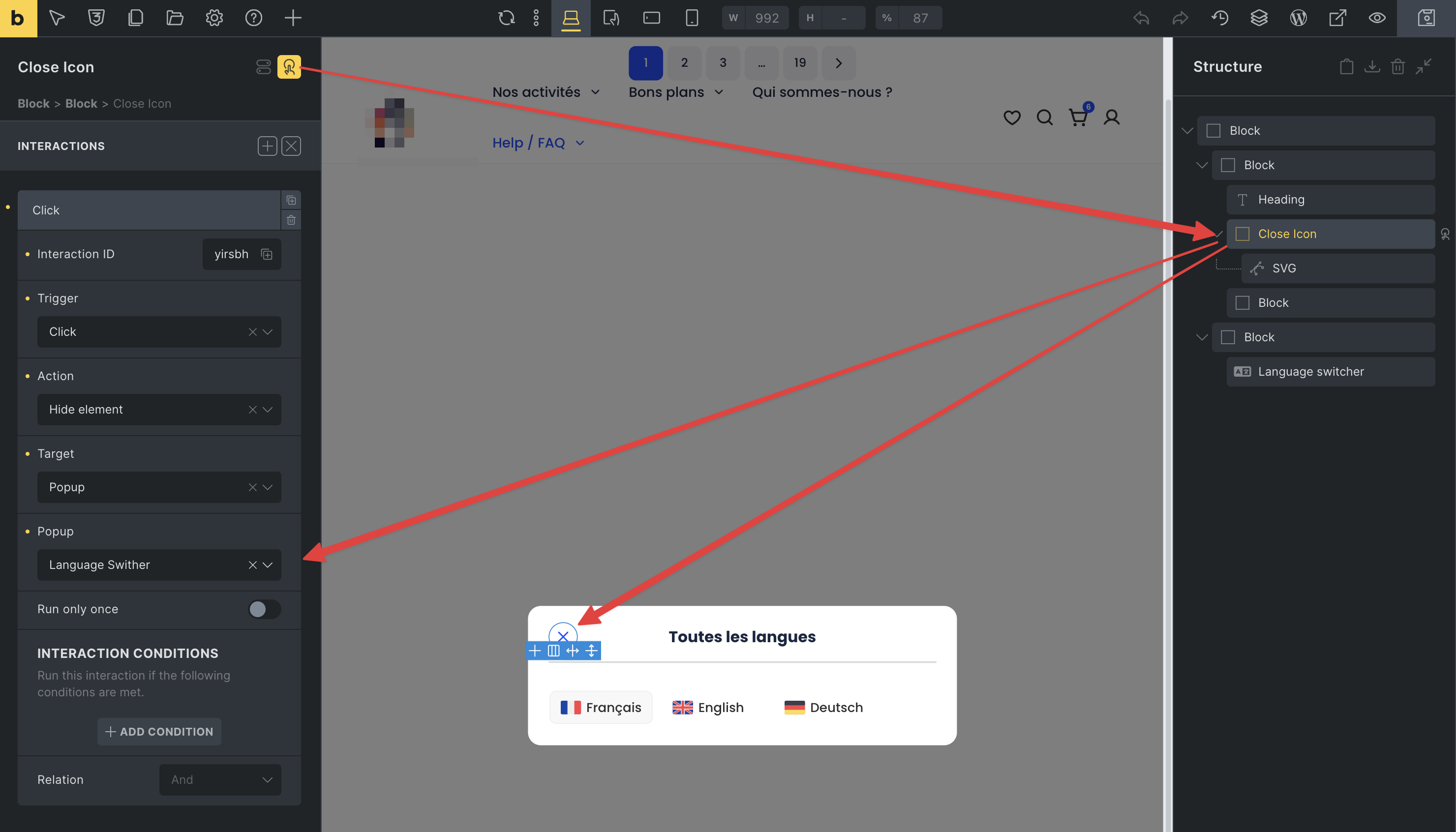 I have translated the header and the popup also, in the translated language the popup is displayed, but I can’t close it on the x button.